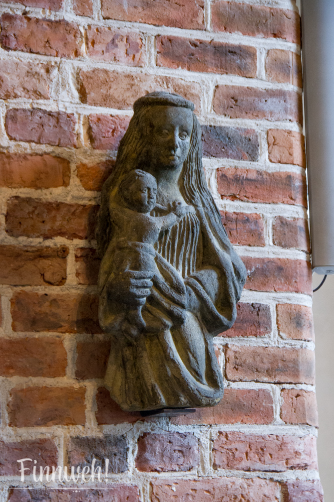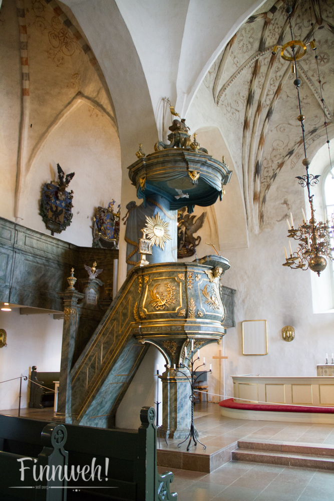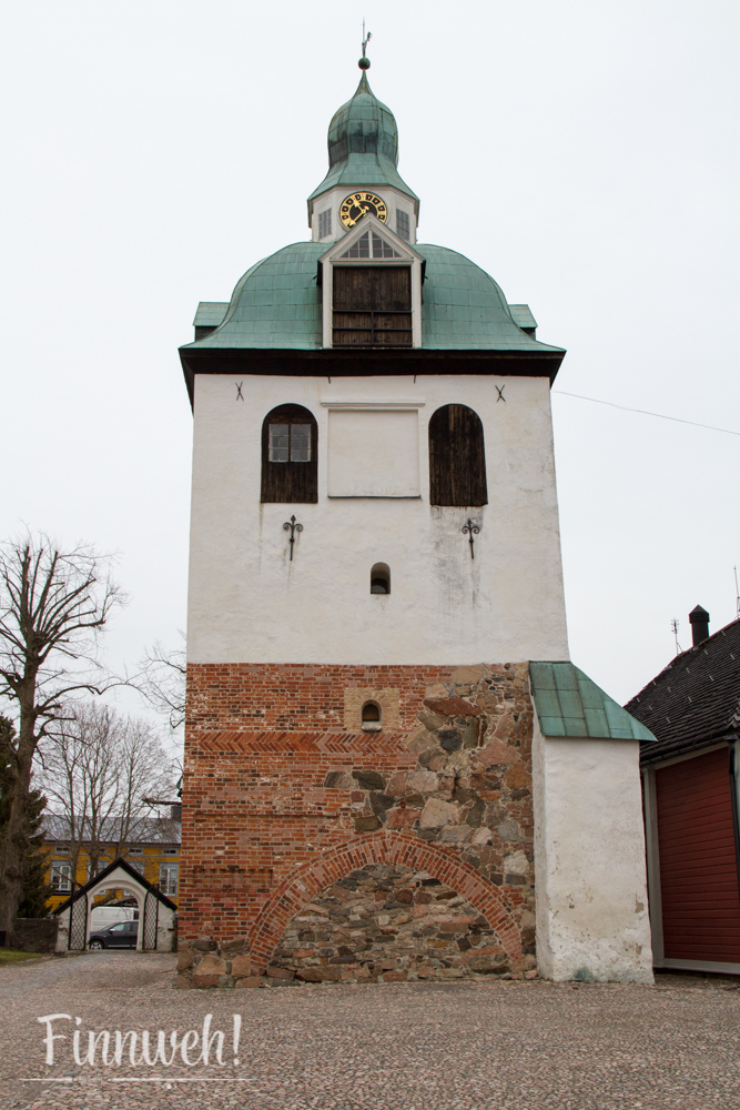 Nach dem Zucker-Boost steht nun noch der mittelalterliche Dom auf unserem Rundgang an. Er überblickt auf seinem Berg die Stadt und ist wie so oft in Finnland eine Kirche ohne Glockenturm. Der steht etwas extra auf dem Platz um das Gebäude. Von außen wirkt sie schlicht und auch im Inneren wirkt sie doch etwas nüchtern. Erbaut wurde der ehemalige Holzbau schon im 13. Jahrhundert, als Finnland zu Schweden gehörte und auch noch alles katholisch war. Als 1410 der Steinbau errichtet wurde weihte man sie der Jungfrau Maria. Kunst aus dieser Zeit findet sich noch immer in dem bei Hochzeitspaaren sehr beliebt alten Gemäuer – Auch Mika Häkkinen hat sich hier schon das Ja-Wort gegeben!