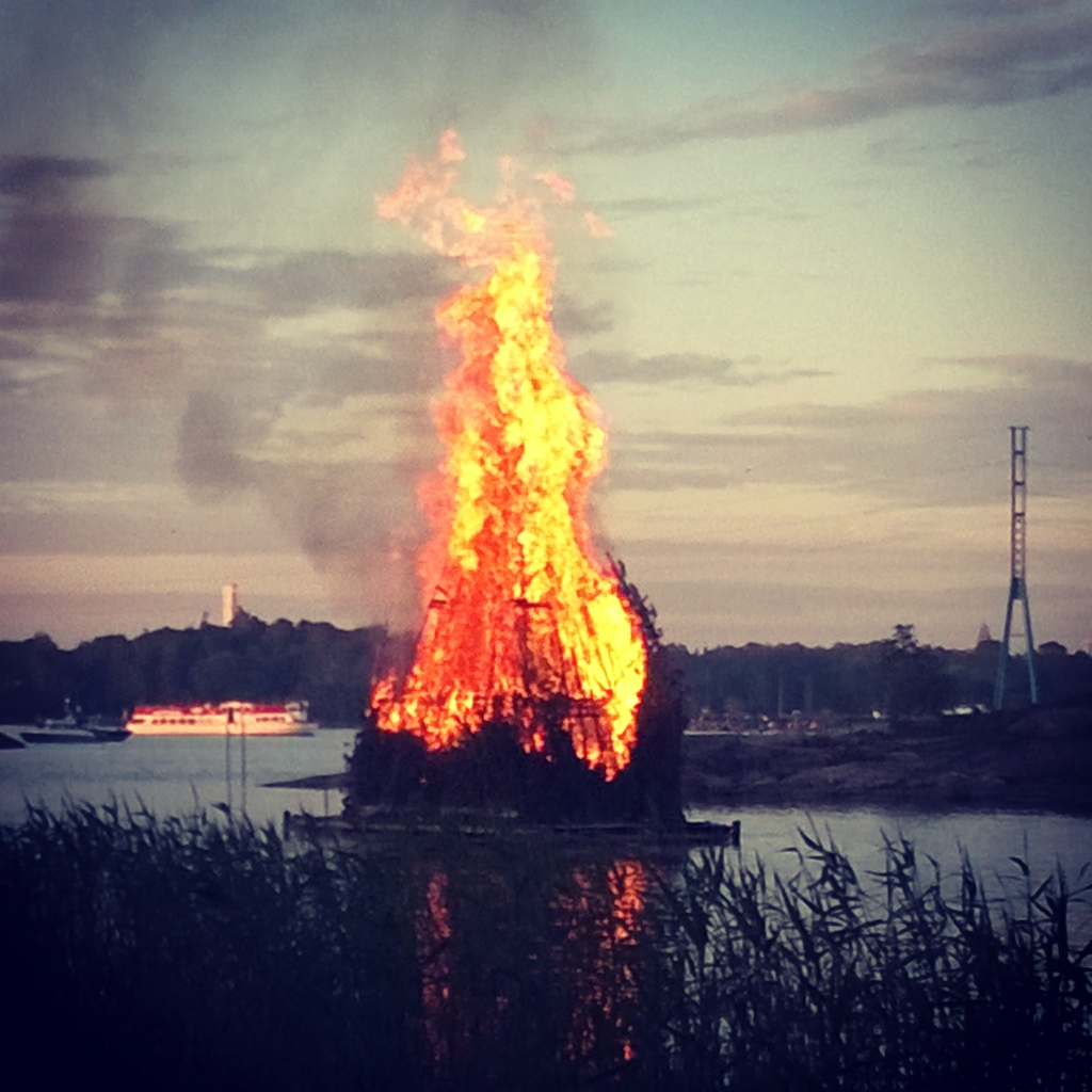 Aus ihrer Mitte erscheint ein Ruderboot. Begeistert sieht man darin das frisch getraute Brautpaar, welches das letzte verbleibende Feuer auf dem Wasser entzünden wird. Die Brautleute steigen auf die Plattform, auf der das Holz getürmt ist. Als es qualmt und sich erste Flammen den Weg nach oben suchen, klatschen und jubeln die Leute, die vom Ufer der Insel mitgefiebert haben. Ein magischer Moment, der so viel Freude und Zufriedenheit in einem weckt. Das ist wohl der Geist von Juhannus, denken wir uns und beobachten das Feuer noch eine ganze Weile schweigend.