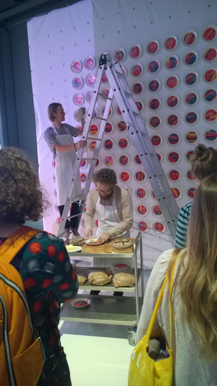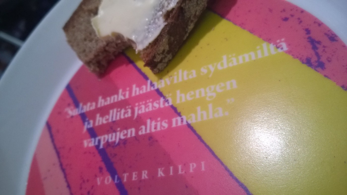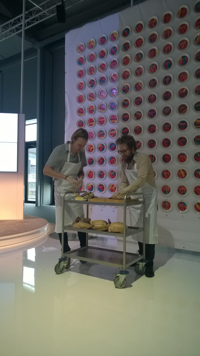 Jussi Karjalainen und Willem Heeffer sind zwei Designer und sie besuchten die Messe mit ihrer Installation “Bread of Word”. Der finnische Grafikdesigner und der niederländische Interiör- und Produktdesigner (beide wohnhaft in Helsinki) haben 196 einzigartig gestaltete Teller mitgebracht. Jeder von ihnen ist mit einem Zitat aus einem finnischen Buch versehen. Mutmacher-Sprüche, nachdenkliche Zeilen und lustige Aufforderungen. Nachdem die Teller gehängt waren und das gesamte Makro-Motiv zeigten wurde jeder Teller mit einer Scheibe Butterbrot an die Besucher verteilt. “Nahrung für den Körper und den Geist” wird der langen Schlange Anstehender erklärt. Das Brot hat Jussi extra aus Finnland mitgebracht (naja in Deutschland gibt’s ja eigentlich auch gutes Brot) – echtes finnisches Roggenbrot mit (irischer) Butter. Dies war in der Tat ein sehr gelungener Abschluss. Das schöne war auch, dass man den Teller mit dem eigenen Zitat mit nach Hause nehmen durfte. Ein tolles Unikat auf Teema-Geschirr. FINNLAND. KREATIV.