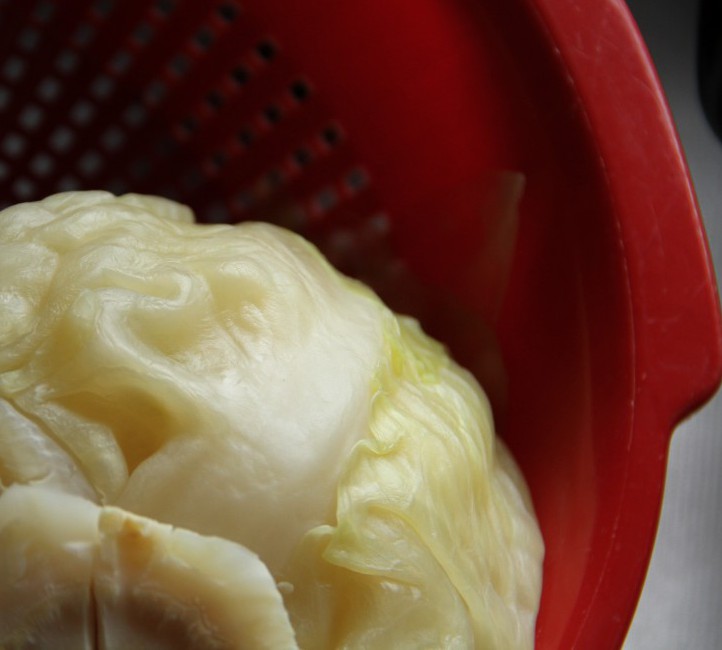 Als erstes muss man den Kohlkopf bearbeiten. Dazu wird der Strunk so gut es geht herausgeschnitten. Man kann auch den Strunk Kreuzweise einschneiden. Mit der Strunkseite nach unten mit etwas Wasser kochen. Allerdings darauf achten, dass er nicht komplett gar ist. Die Blätter garen später im Ofen ja noch nach.