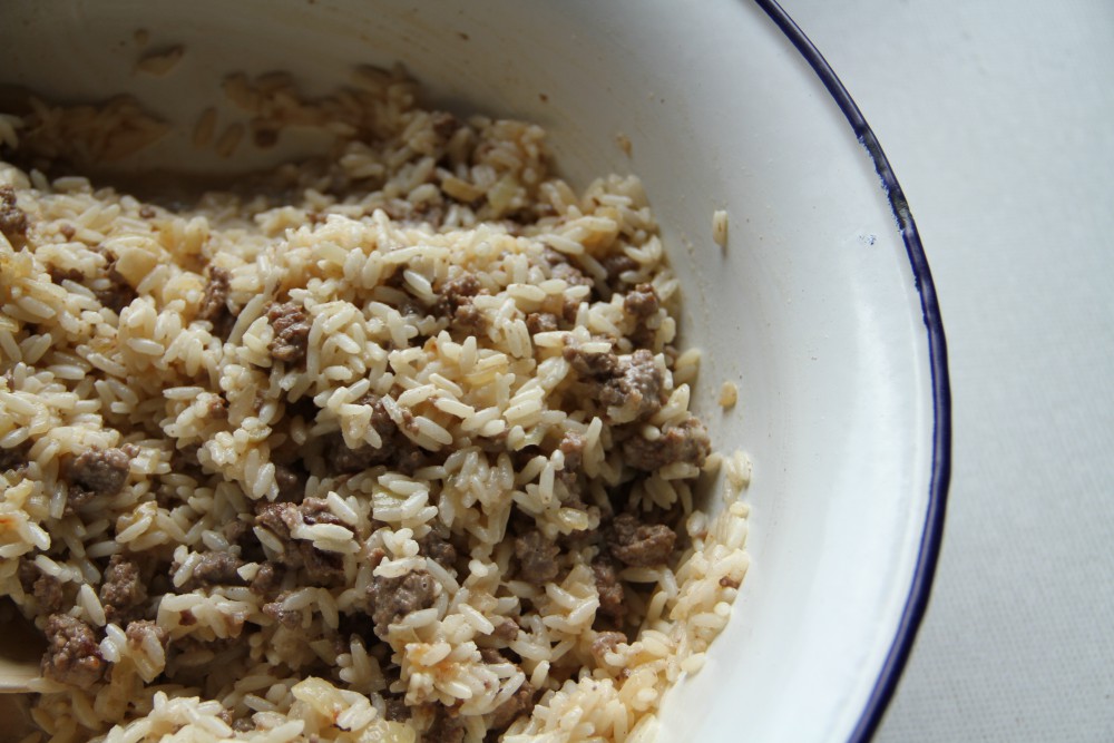 In einer Schüssel zuerst Eier, Milch und Sahne mischen. Dann den Reis und die Hackmischung dazu unterheben. Fertig ist die Füllung.
