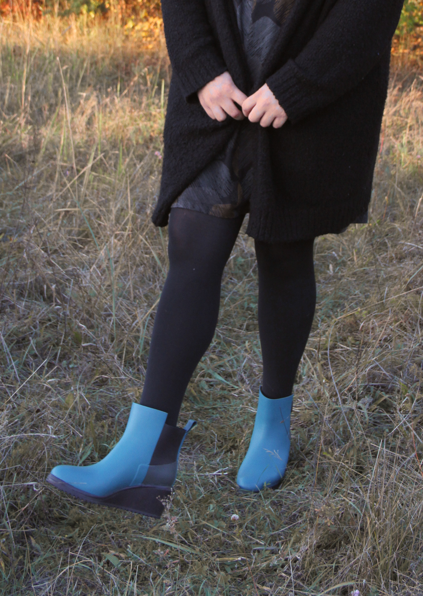 Das eigentliche Highlight sind aber die Schuhe. Falls ihr euch schon gewundert habt, wieso ich dauernd von Gummistiefeln rede, ich aber Wedges an habe, dann lasst euch sagen, dass diese Schuhe echt perfekt für jede pragmatische Frau sind. Diese hübschen Schuhe sind hergestellt wie richtige Gummistiefel von Nokian Footwear aus Finnland. Sie sind auch aus Gummi gemacht und haben natürlich alle Vorteile. Perfekt für das momentane Herbstwetter bei Regen, Nässe und vielleicht auch schon bald Schnee? Falls es kühler wird draußen dann kann man ganz easy auch dickere Socken darin anziehen. Sie passen sich wunderbar der Fußform an und halten perfekt.