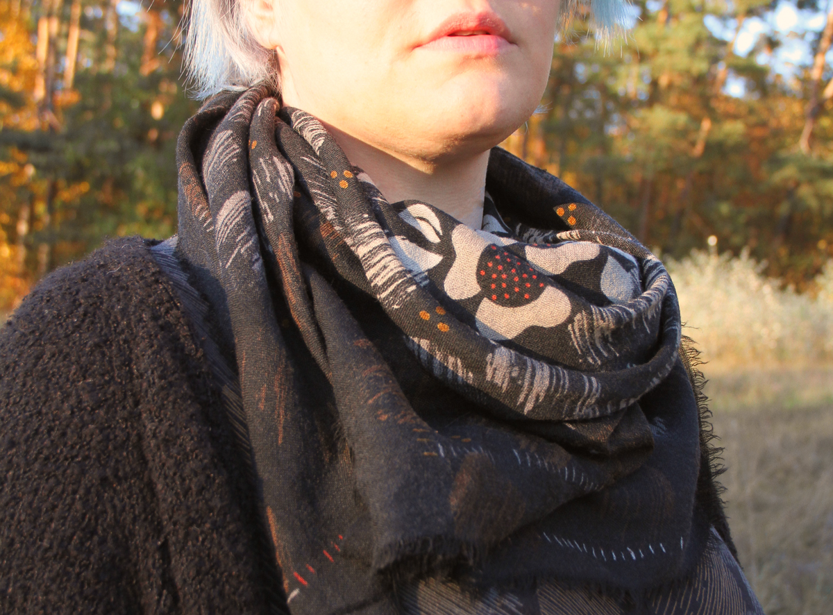 Der dazu passenden Schal aus der gleichen Kollektion greift sowohl das Blättermuster des Kleides als auch die Farben auf und mischt sich perfekt zum Outfit. Der Oversize-Look kommt mir echt entgegen und ist ja auch im Norden schon seit einiger Zeit sehr angesagt. Also ein Muss für mich.